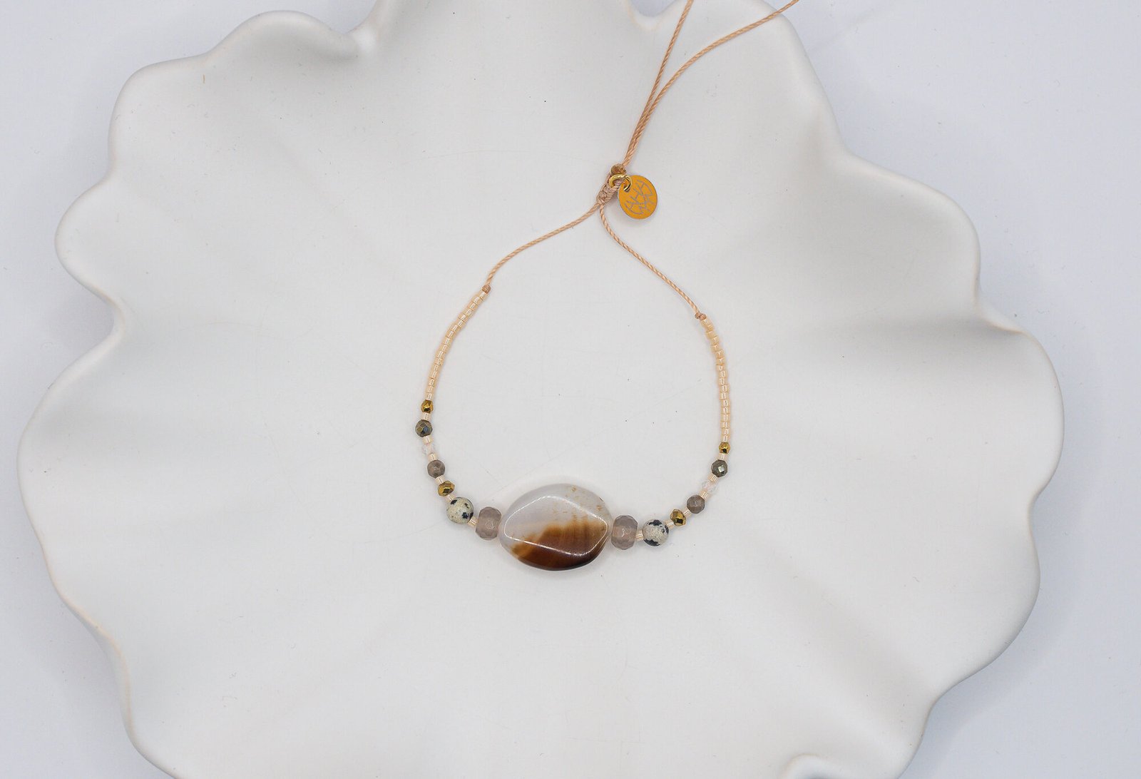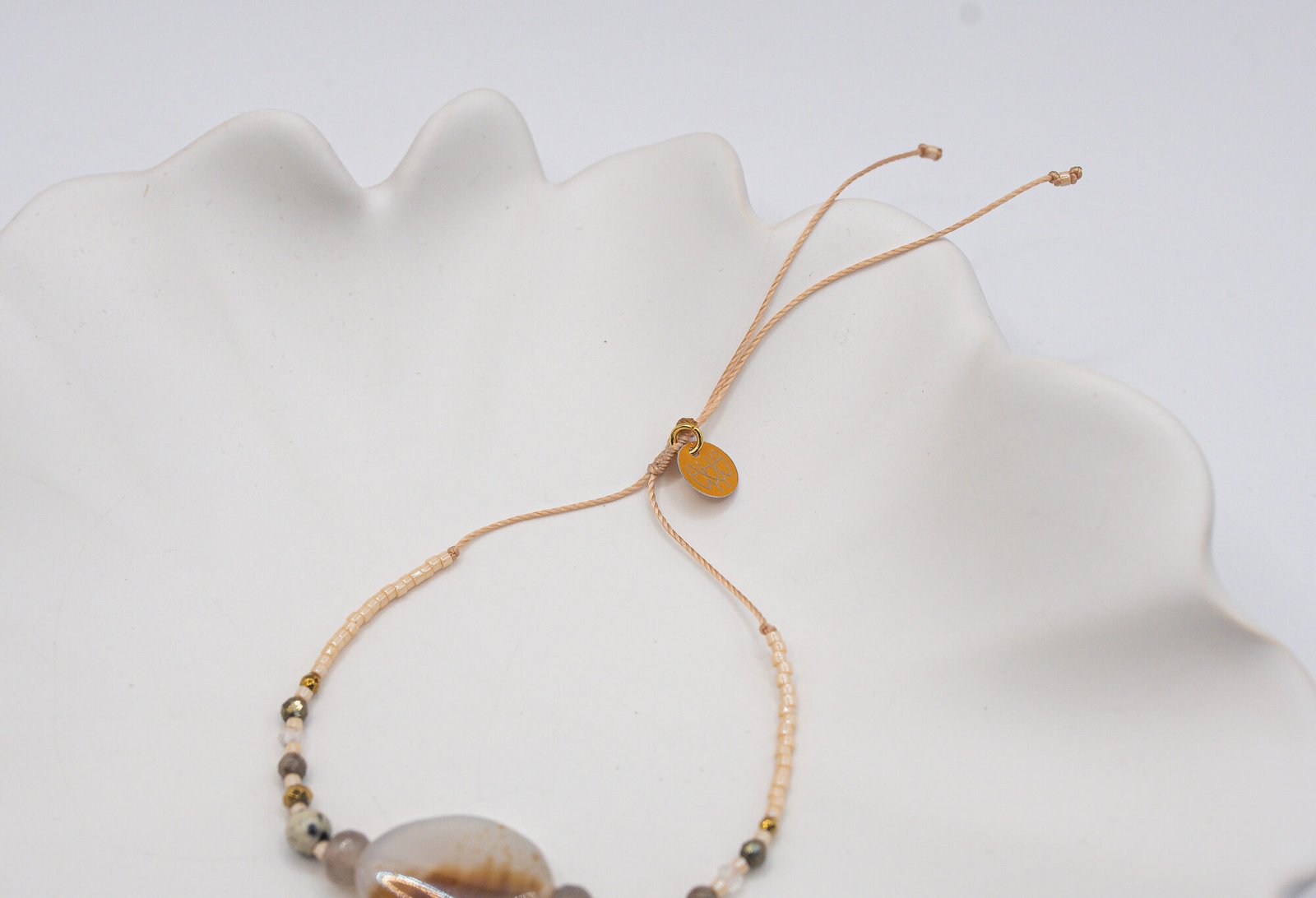 Rozmiar bransoletki jest uniwersalny dzięki zapięciu typu makrama. Wszystkie elementy są całkowicie antyalergiczne i bezpieczne dla skóry.