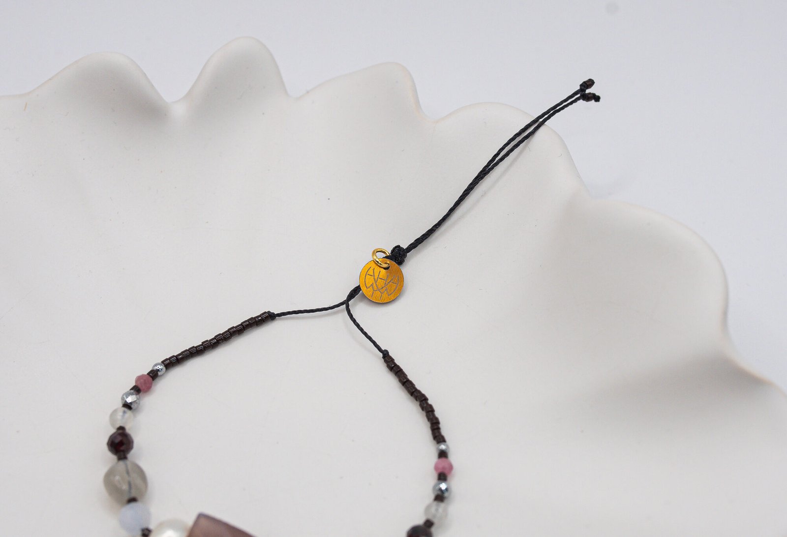 Użyte materiały: Kwarc, Perła, Chalcedon, Granat Kamień Słoneczny, Kamień Księżycowy (Selenit), Turmalin, Hematyt, Nylon, Japońskie Szkło. Szczegółowe działanie kamieni znajdziesz w opisie poniżej!
