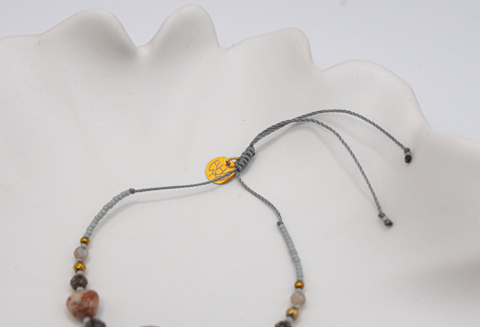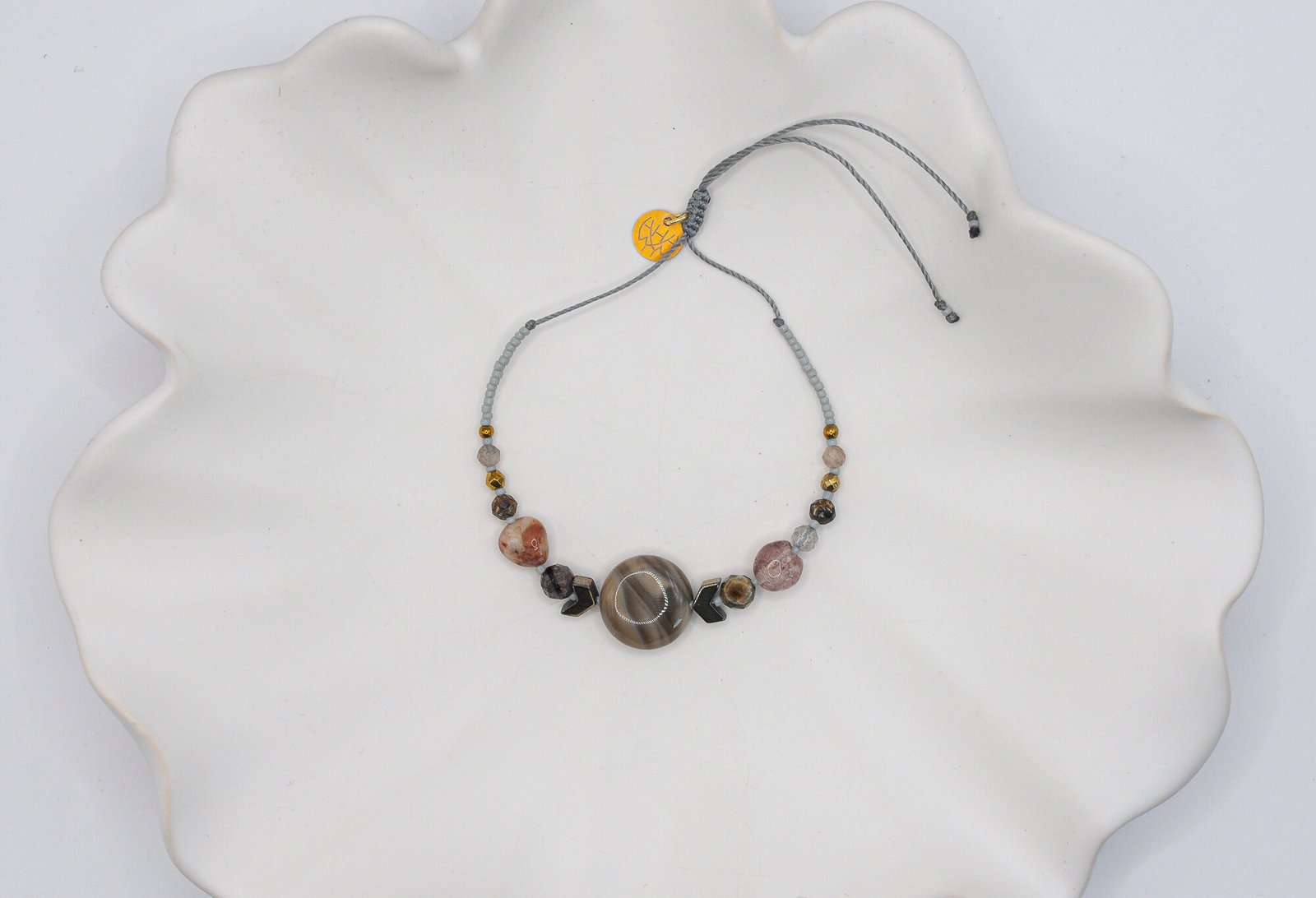 Użyte materiały: Krzemień Pasiasty, Turmalin, Turkus, Labradoryt, Hematyt, Nylon, Japońskie Szkło. Szczegółowe działanie kamieni znajdziesz w opisie poniżej!