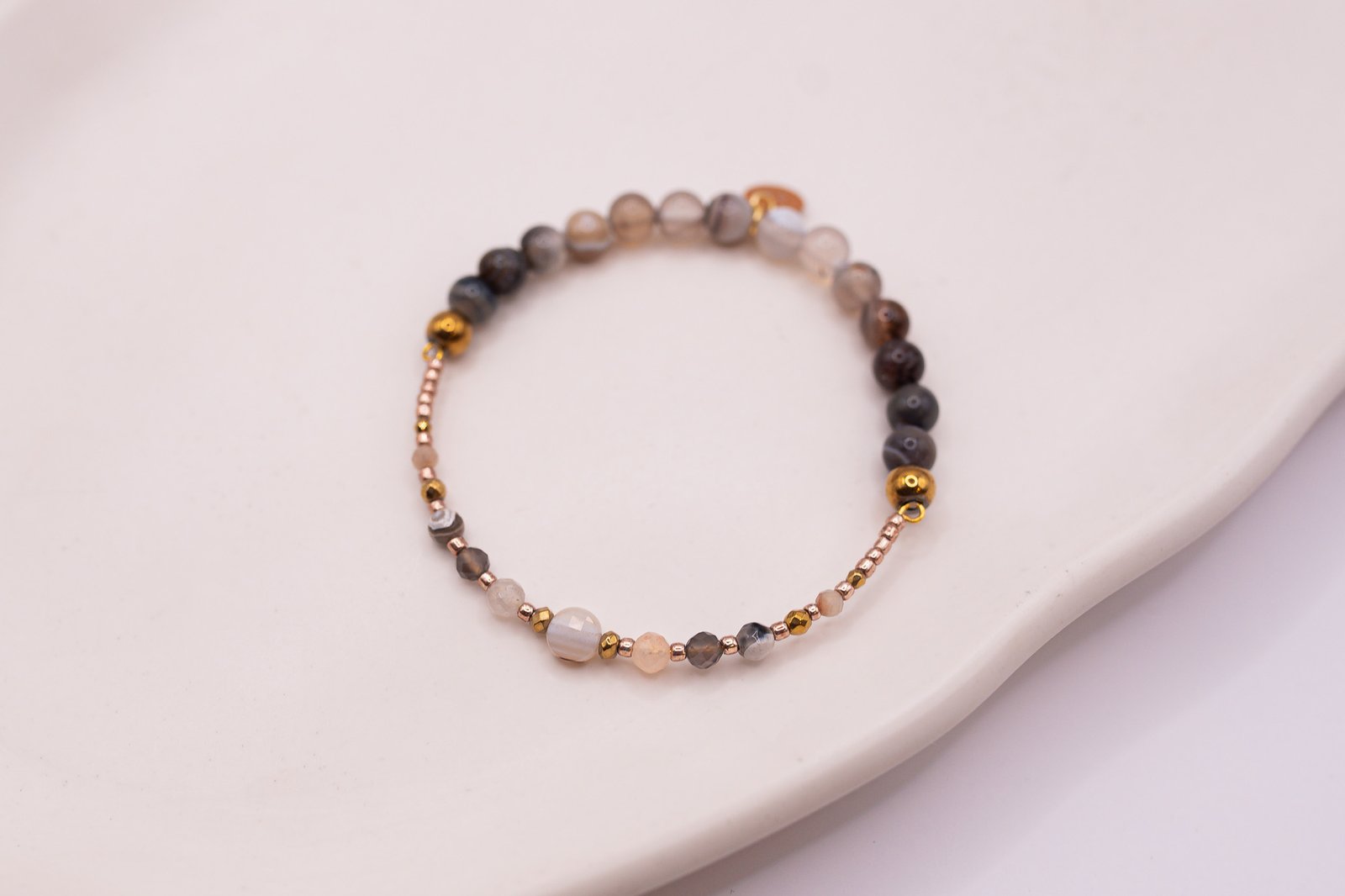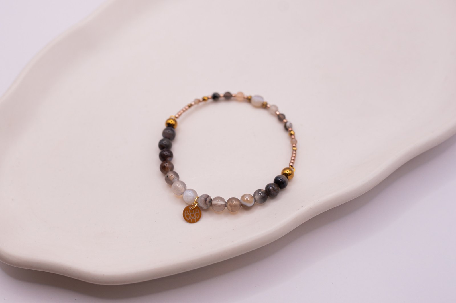 Bransoletka została wykonana przy użyciu okrągłego Agatu, który połączyliśmy w części sztywnej z drobnymi Obsydianami i Awenturynami. W części elastycznej znajdują się gładkie Agaty (6 mm) a za wykończenie całości odpowiada Hematyt o pięknym blasku złota. Wszystkie elementy w biżuterii są 100% antyalergiczne.