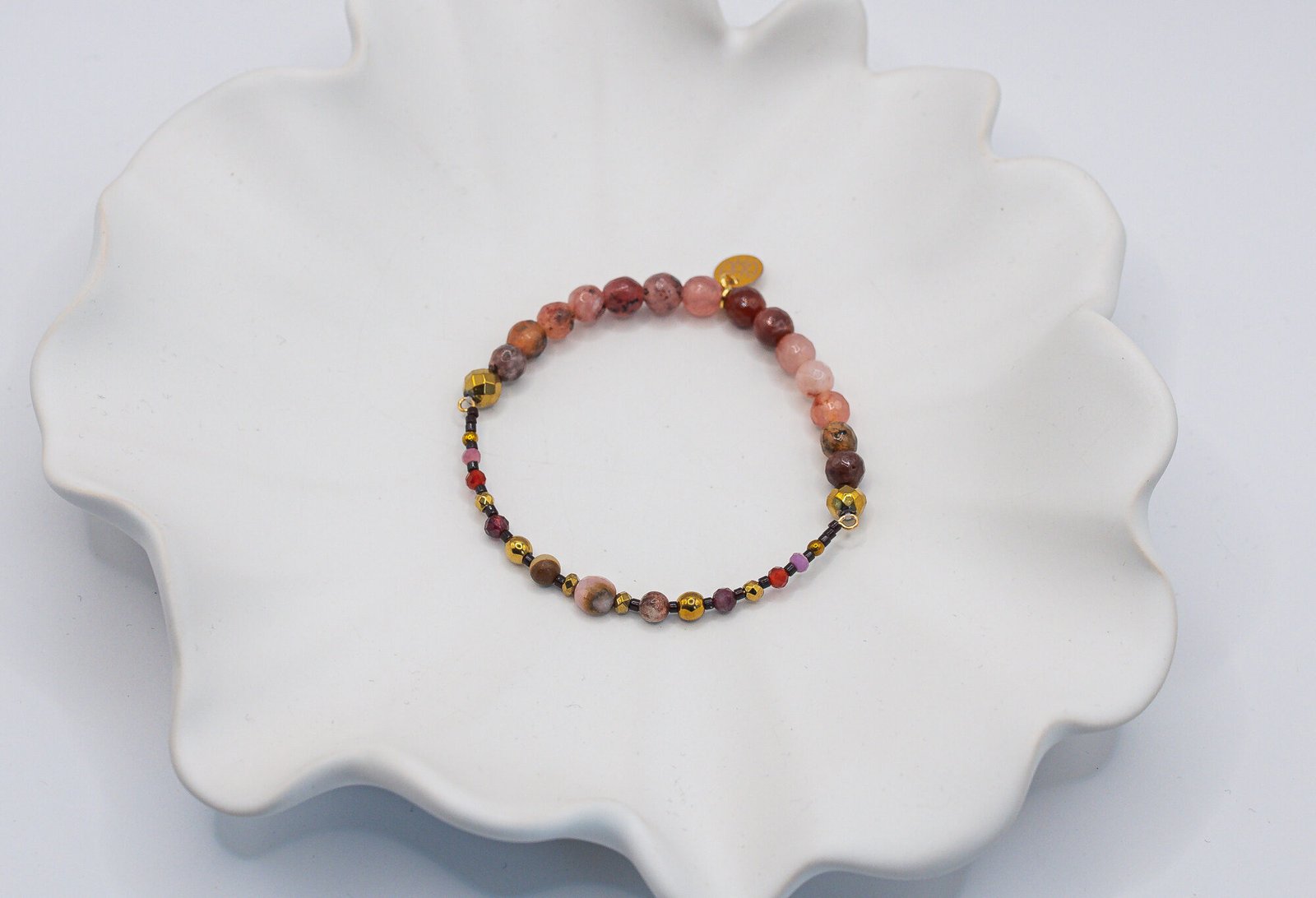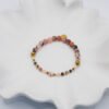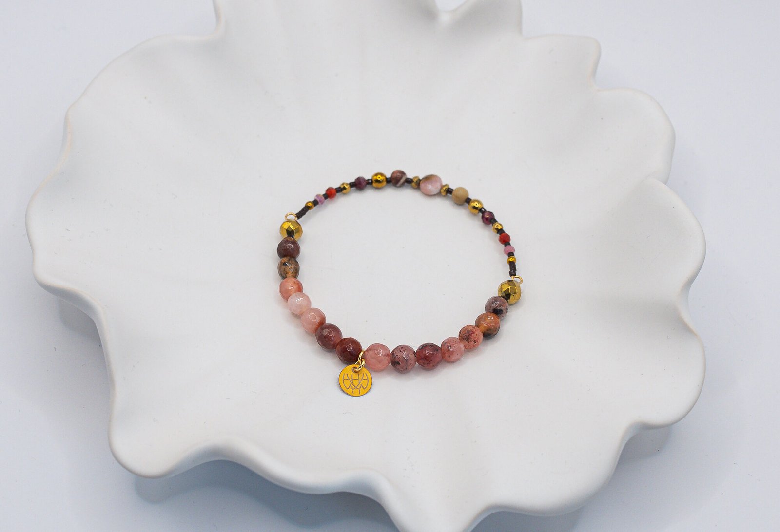 Bransoletka została wykonana przy użyciu okrągłego Opalu, który połączyliśmy z drobnymi Jaspisami, Granatami, Karneolami oraz Turmalinami w części sztywnej. Natomiast w części elastycznej użyliśmy fasetowane Agaty (6 mm), a za wykończenie kompozycji odpowiada złoty Hematyt. Wszystkie elementy w biżuterii są 100% antyalergiczne.