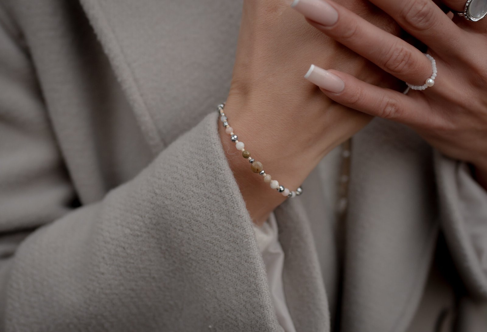 Bransoletka została wykonana przy użyciu okrągłego Opalu, który połączyliśmy z drobnymi Mokaitami i Opalami w części sztywnej. Natomiast w części elastycznej użyliśmy fasetowane Opale oraz Jaspis Dalmatyński (6 mm), a za wykończenie kompozycji odpowiada srebrny Hematyt. Wszystkie elementy w biżuterii są 100% antyalergiczne.