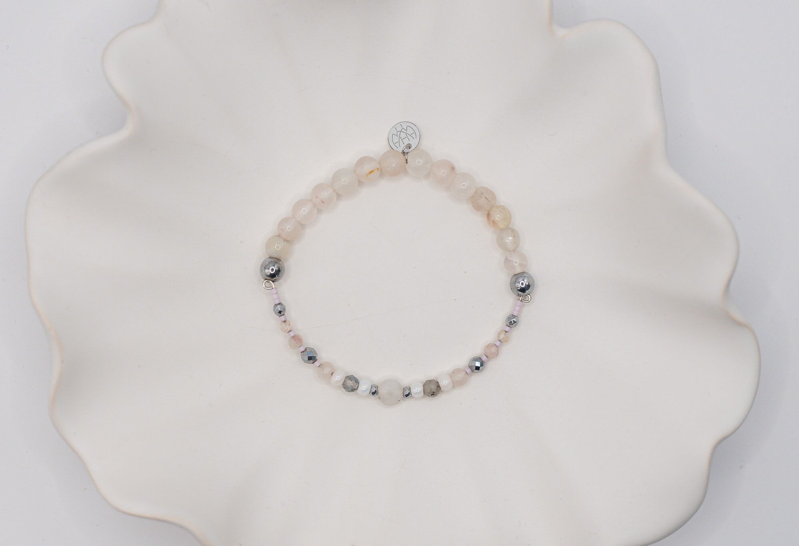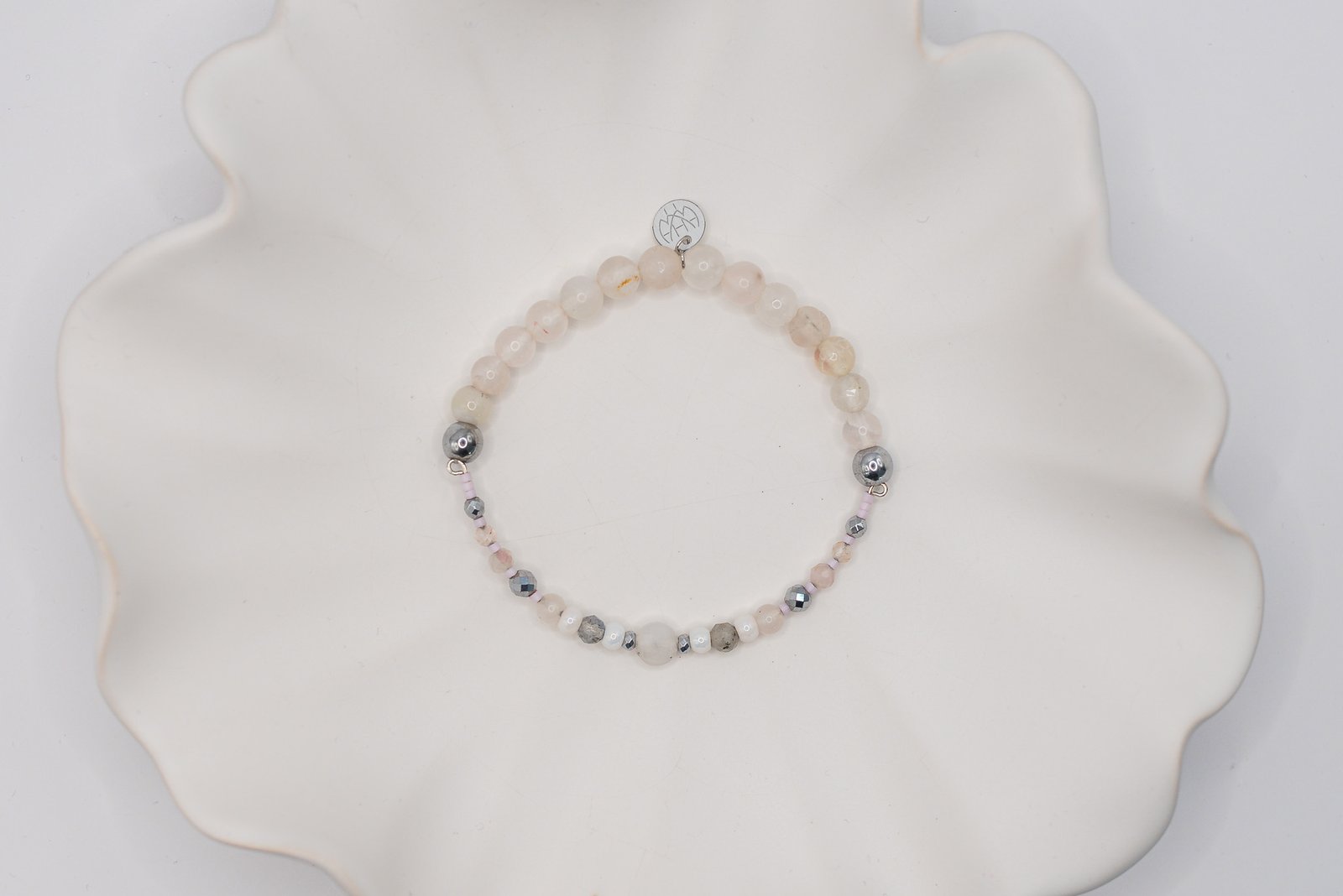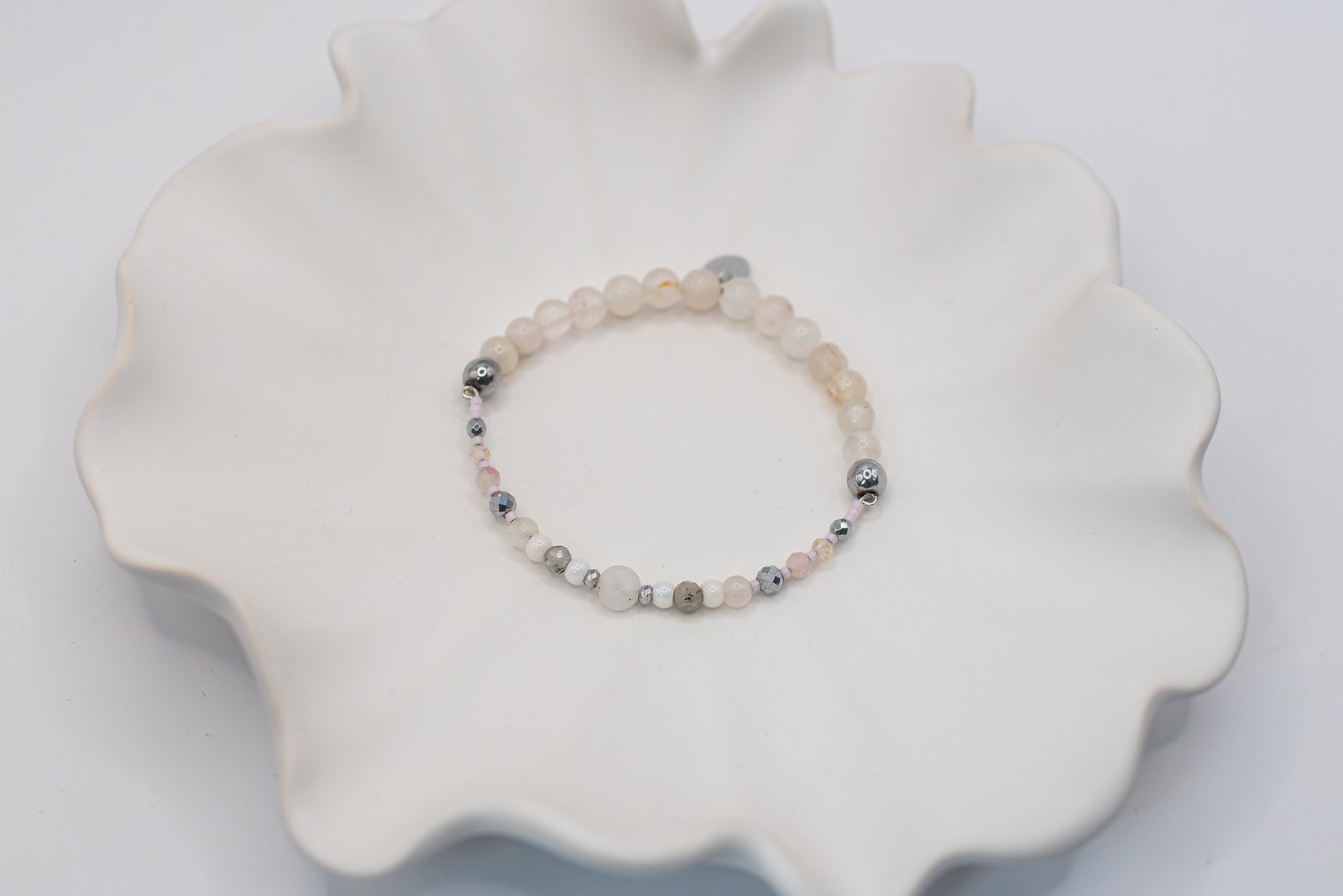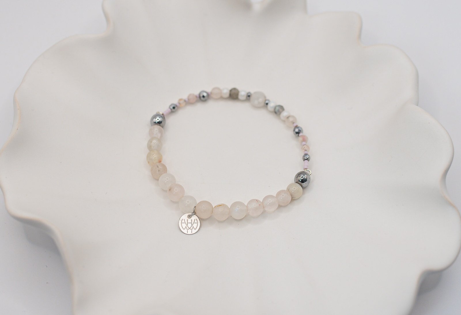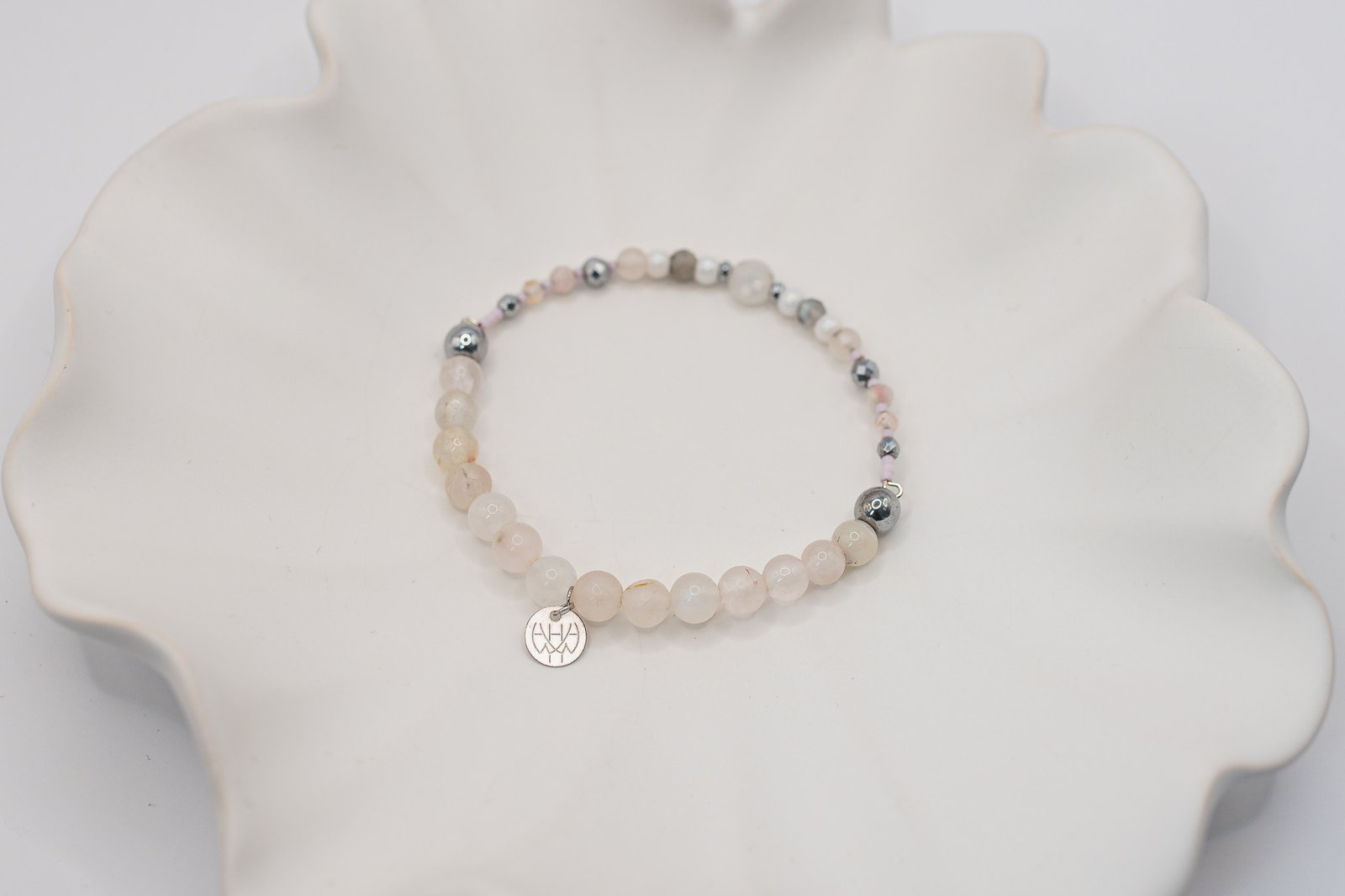 Bransoletka została wykonana przy użyciu okrągłego Opalu połączonego w części sztywnej z Labradorytem oraz Turmalinem. W części elastycznej znajdują się Kwarce Różowe a za wykończenie całości odpowiada Hematyt o pięknym srebrnym kolorze. Wszystkie elementy w biżuterii są 100% antyalergiczne.