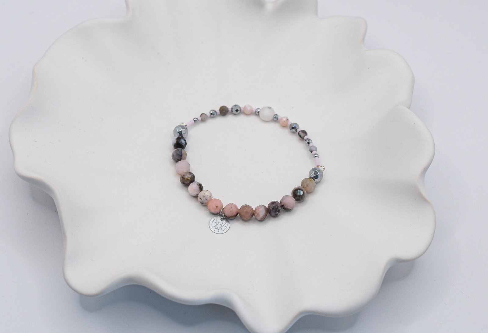 Bransoletka została wykonana przy użyciu okrągłego Opalu, który połączyliśmy z drobnymi Jaspisami oraz Opalami  w części sztywnej. Natomiast w części elastycznej użyliśmy fasetowane Opale Różowe (6 mm), a za wykończenie kompozycji odpowiada srebrny Hematyt. Wszystkie elementy w biżuterii są 100% antyalergiczne.