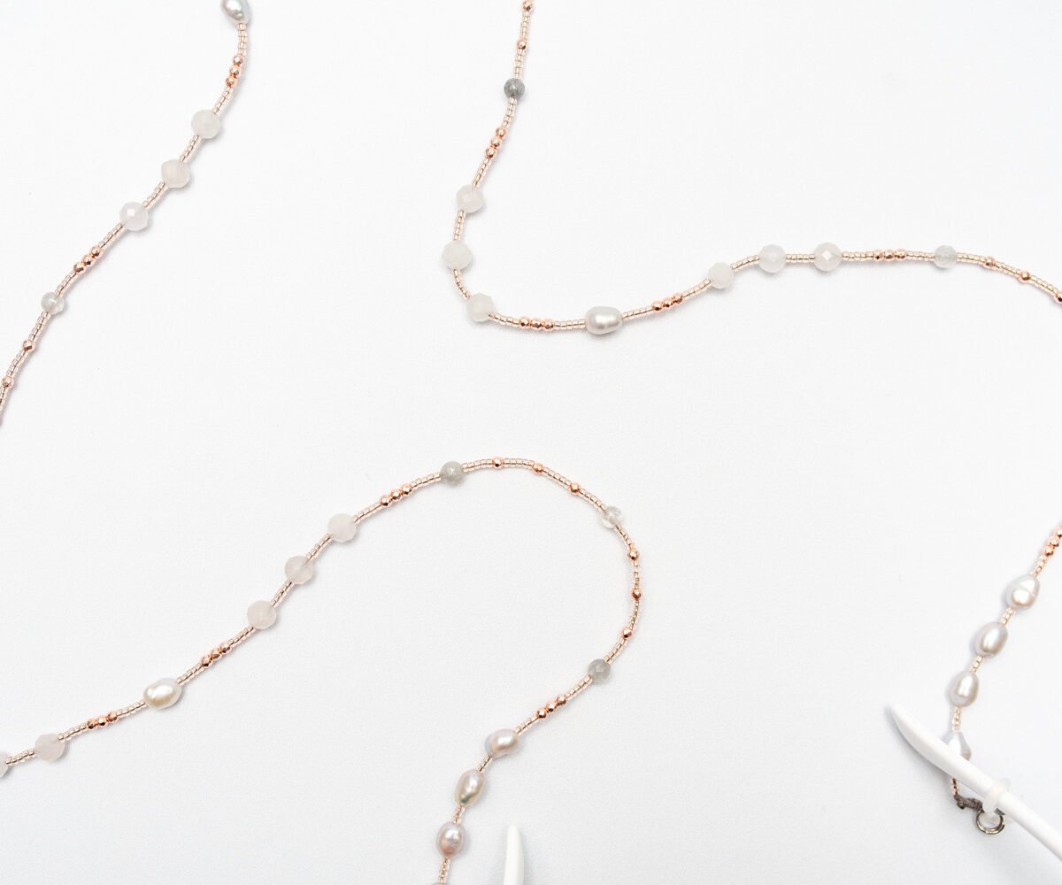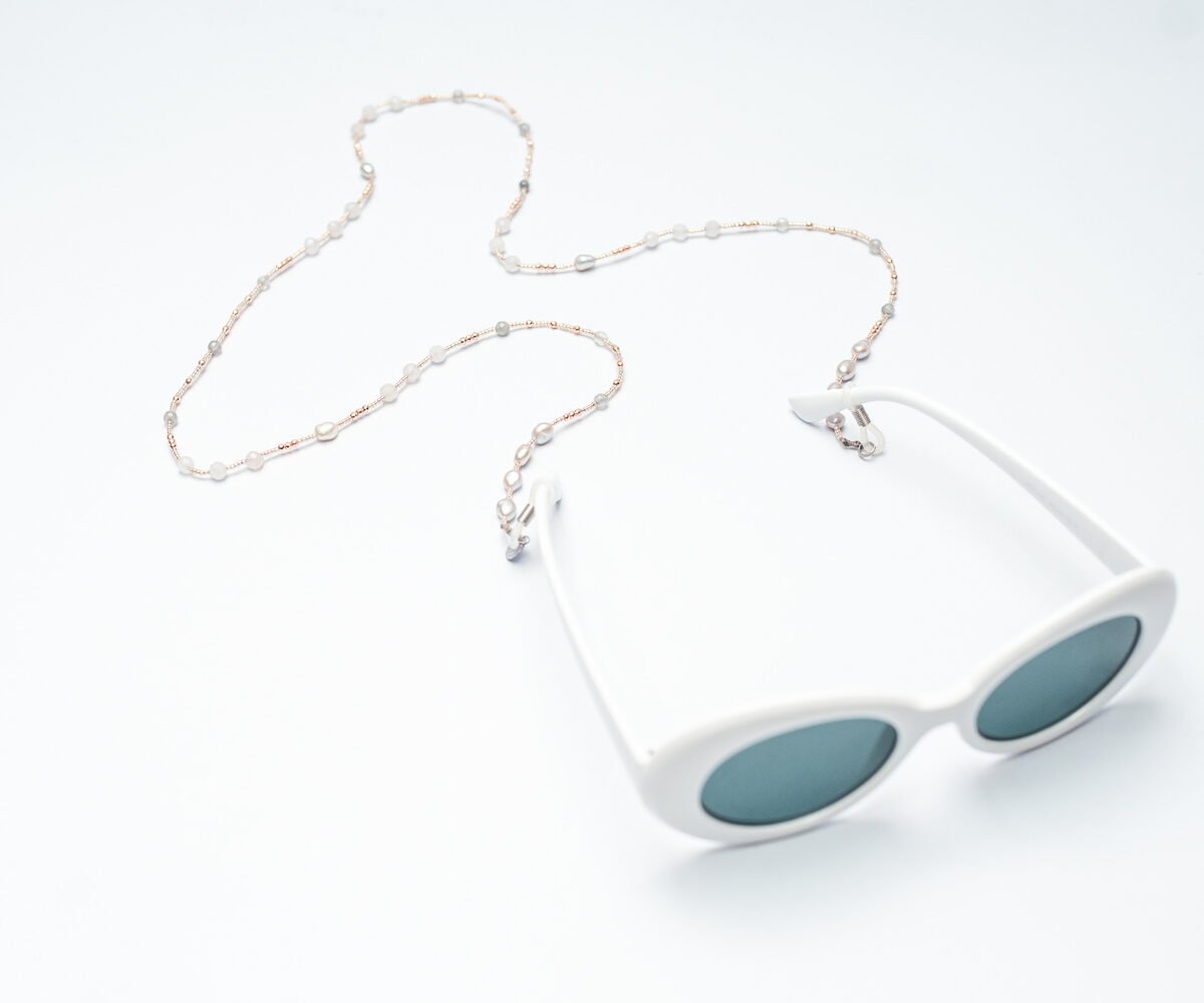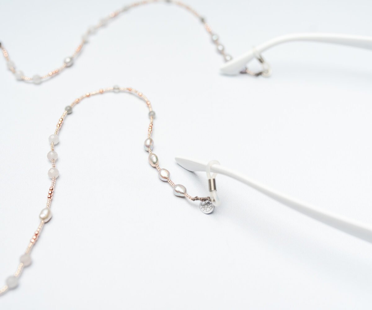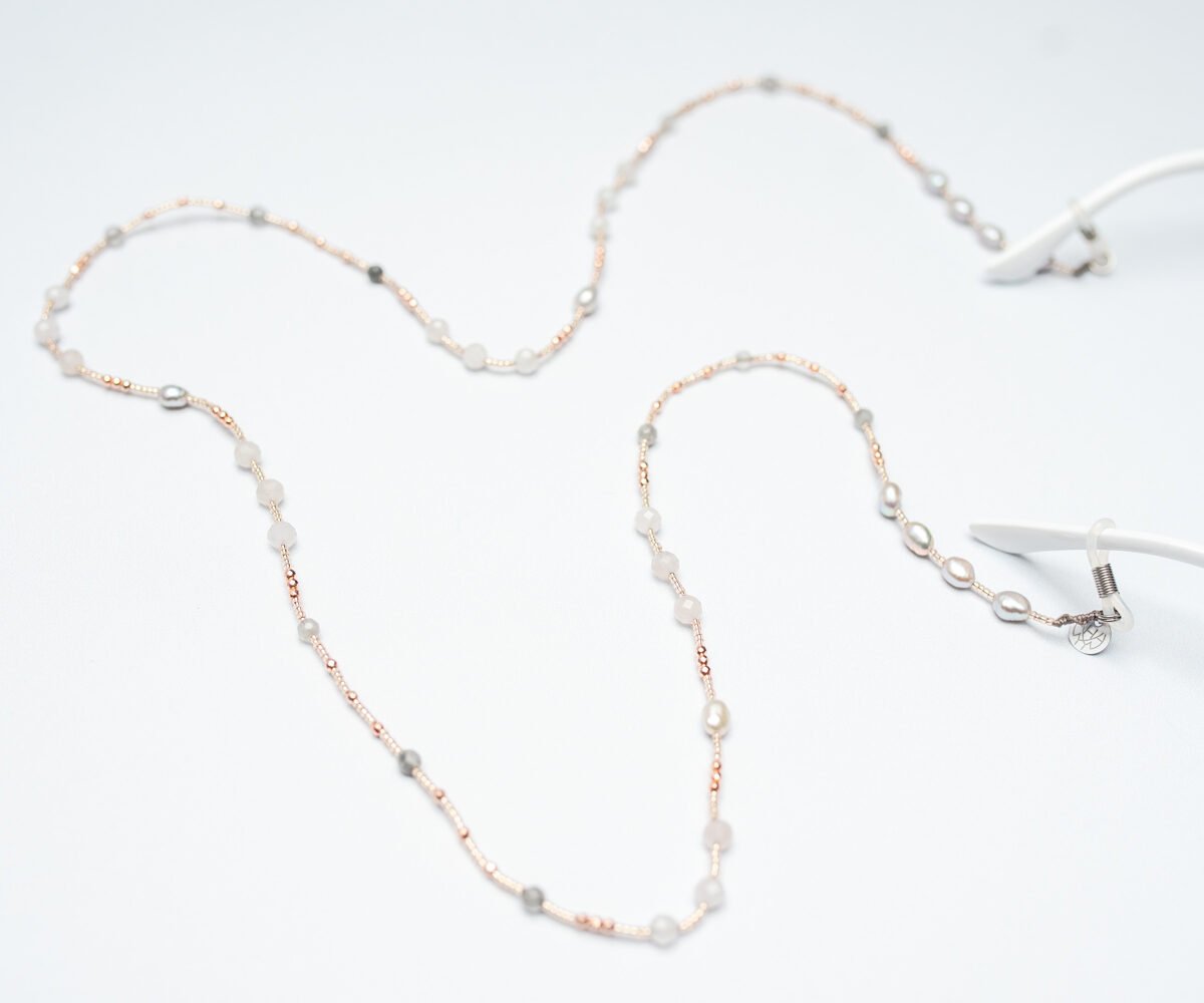 Łańcuszek do okularów wykonany ręcznie ze srebrnych Pereł oraz fasetowanych Kwarców Różowych połączonych z Kwarcem Szarym.