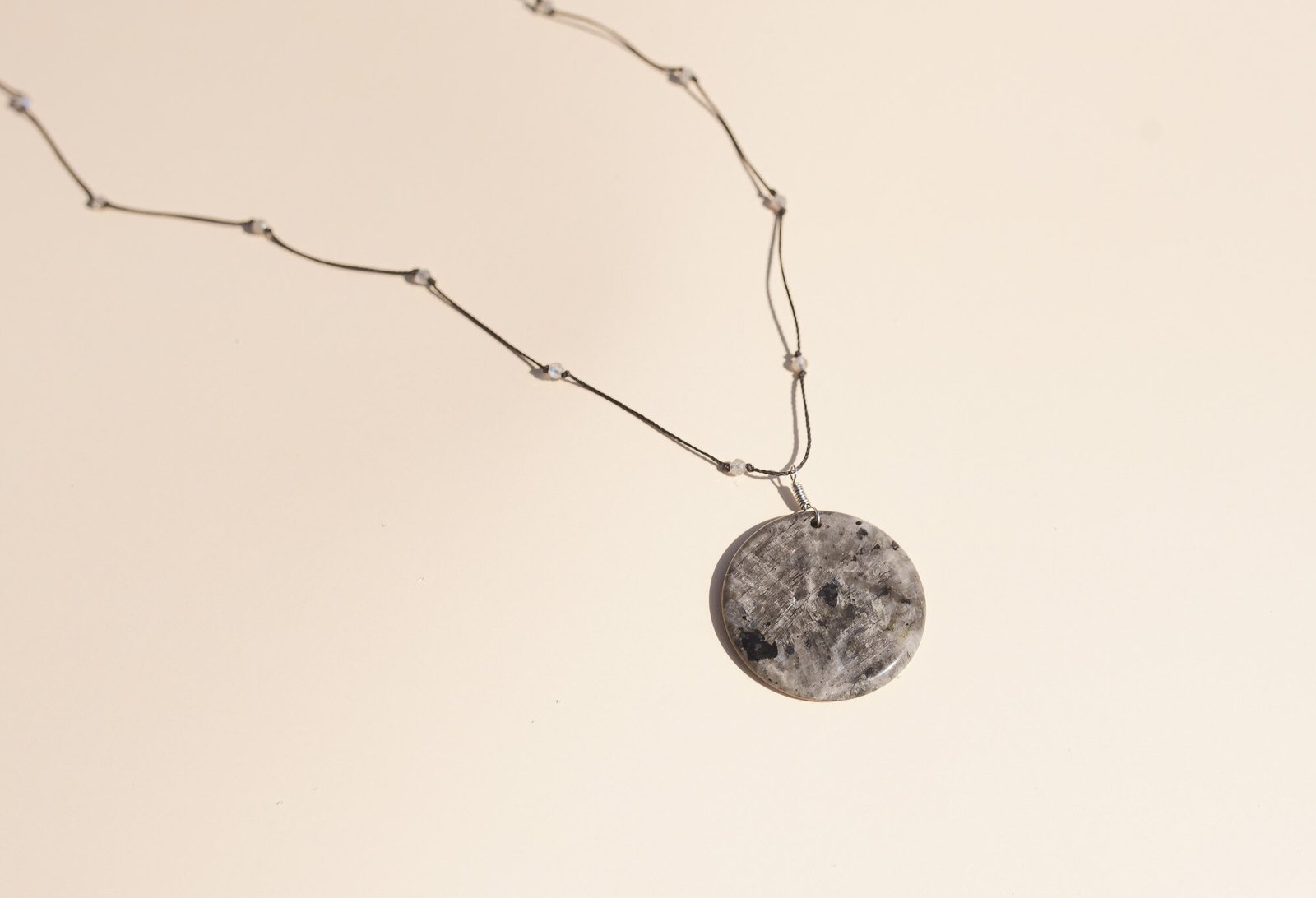Wisiorek z Okrągłym Labradorytem stworzyliśmy ręcznie przy pomocy naturalnego okrągłego Labradorytu, do którego dodaliśmy drobne fasetowane Labradoryty na sznureczku. Labradoryt cechuje się wyjątkową opalizacją. Stworzona przez nas konstrukcja wisiorka sprawia że układa on się wyjątkowo pięknie niezależnie od sytuacji. Naszyjnik jest wyjątkowo wytrzymały oraz wodoodporny, a wszystkie użyte materiały są antyalergiczne. Wykończenie naszyjnika jest w kolorze srebrnym.