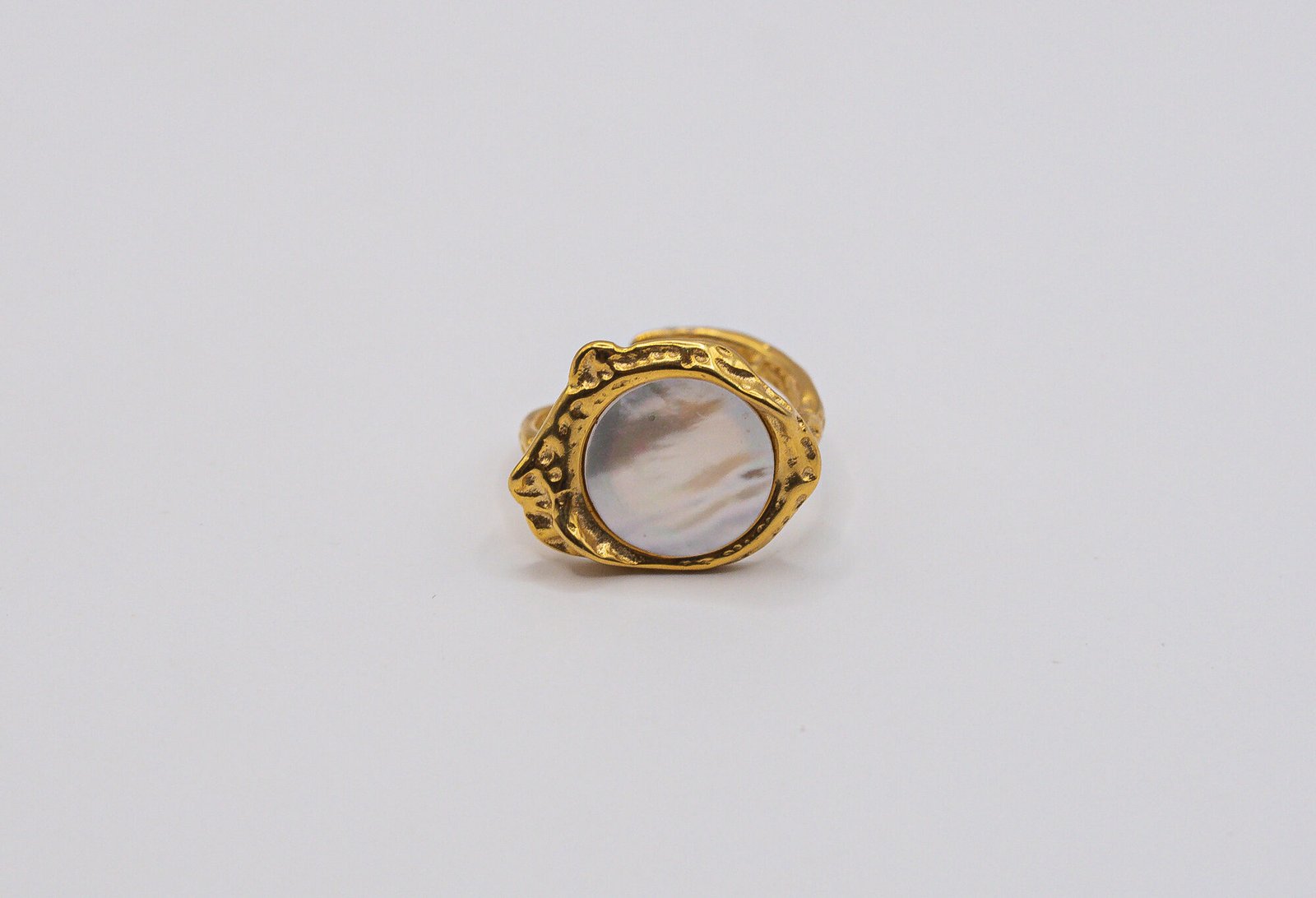 Pierścionek ze stali Dream to połączenie organicznej formy z nieregularną fakturą. W tej wyjątkowej bazie umieszczony został krążek z masy perłowej o delikatnej opalizacji.